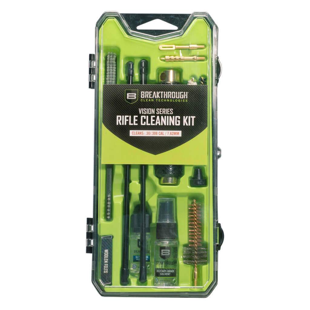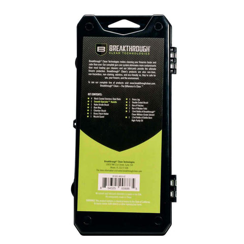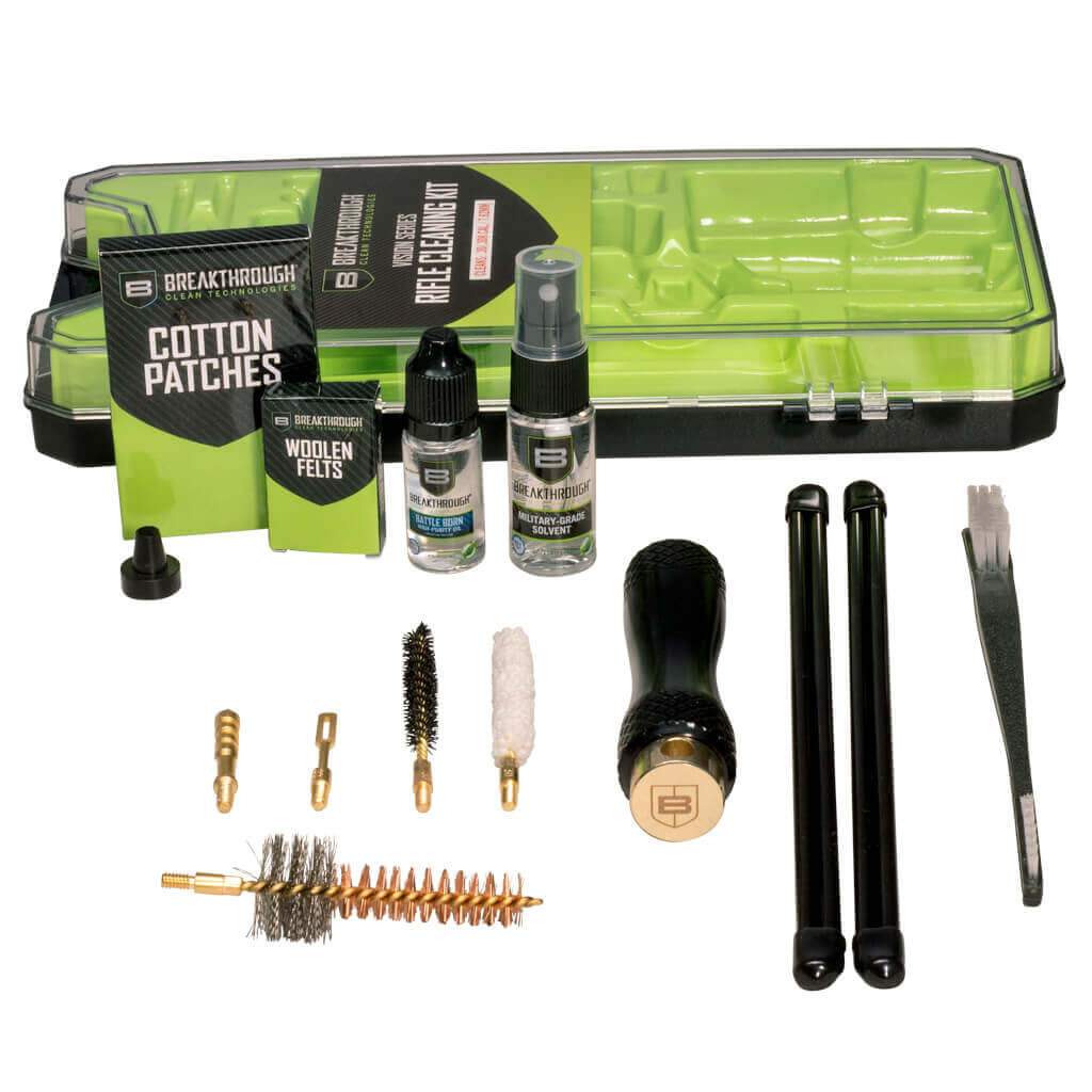 These cleaning kits come with cleaning rod sections, various hard bristle nylon brushes, jags, patch holders, and cotton patches. Also included is our durable and detachable aluminum handle with knurling for an easy grip and our mini bottles of Breakthrough® Military-Grade Solvent and Battle Born High-Purity Oil.