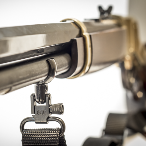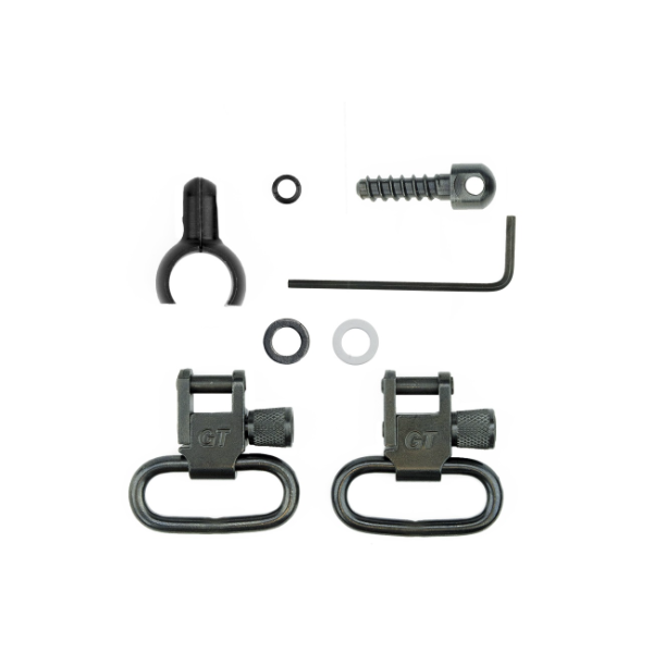 Set includes 2-piece barrel band, 3/4” wood screw rear swivel stud with spacers and a pair locking swivels.