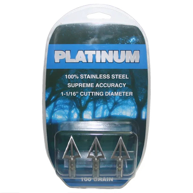 Platinum 3-blade 100 grain weight fixed broadheads offer optimum performance in the field. These one-piece construction broadheads cut on contact which delivers maximum penetration and offers up to a 1-1/16″ cutting diameter.