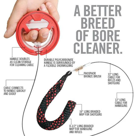 The single piece Dual Action Cable with integrated phosphor bronze brush and braided mop wraps around the unique Flex-Case Handle to keep the system stowed and organized. To use, simply flip, feed, clip and pull. Throw it in your pack, or put it in your pocket. It’s the next best thing to a self-cleaning gun.