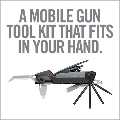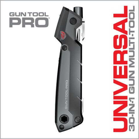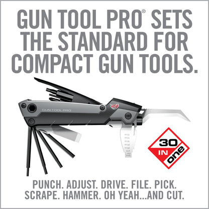 Made for rifles and shotguns, Gun Tool Pro’s rock-solid frame features 30 hard-working tools. Two-inch long bits fit into the magnetic 1/4" driver and 1/4" wrench for extra torque. It features two files, a locking claw-point knife and a removable magnetic storage container for holding small screws and pins. It also features a universal choke wrench and tap hammer, all in a sleek and tactical design. Gun Tool Pro sets the standard for compact gun tools.The Gun Tool Pro is the next generation of The Gun Tool — the #1 gun multi-tool on the planet. We didn't just want to add more "stuff" and call them improvements, we made it better. Gun Tool Pro features 30 hard-working tools, including longer bits, a standard 1/4'' bit driver, a 1/4'' bit wrench for extra torque, a dual-surface file, a new longer locking claw point knife, tap hammer and a removable magnetic storage container for holding small screws and pins. It also features a universal choke wrench. All in a rock-solid frame and a sleek tactical design. Gun Tool Pro is the new "go to" tool for gun owners.